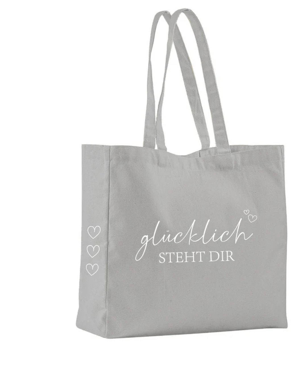 Diese robuste und liebevoll bedruckte Baumwolltasche mit langen Henkeln und dem Aufdruck "Glücklich steht dir" begleitet dich durch den Alltag, bei Shoppingtouren und Co. Sie bietet mühelos Platz für alles, was du brauchst. Ideal geeignet ist die Tasche auch zum Verschenken an liebe Menschen.