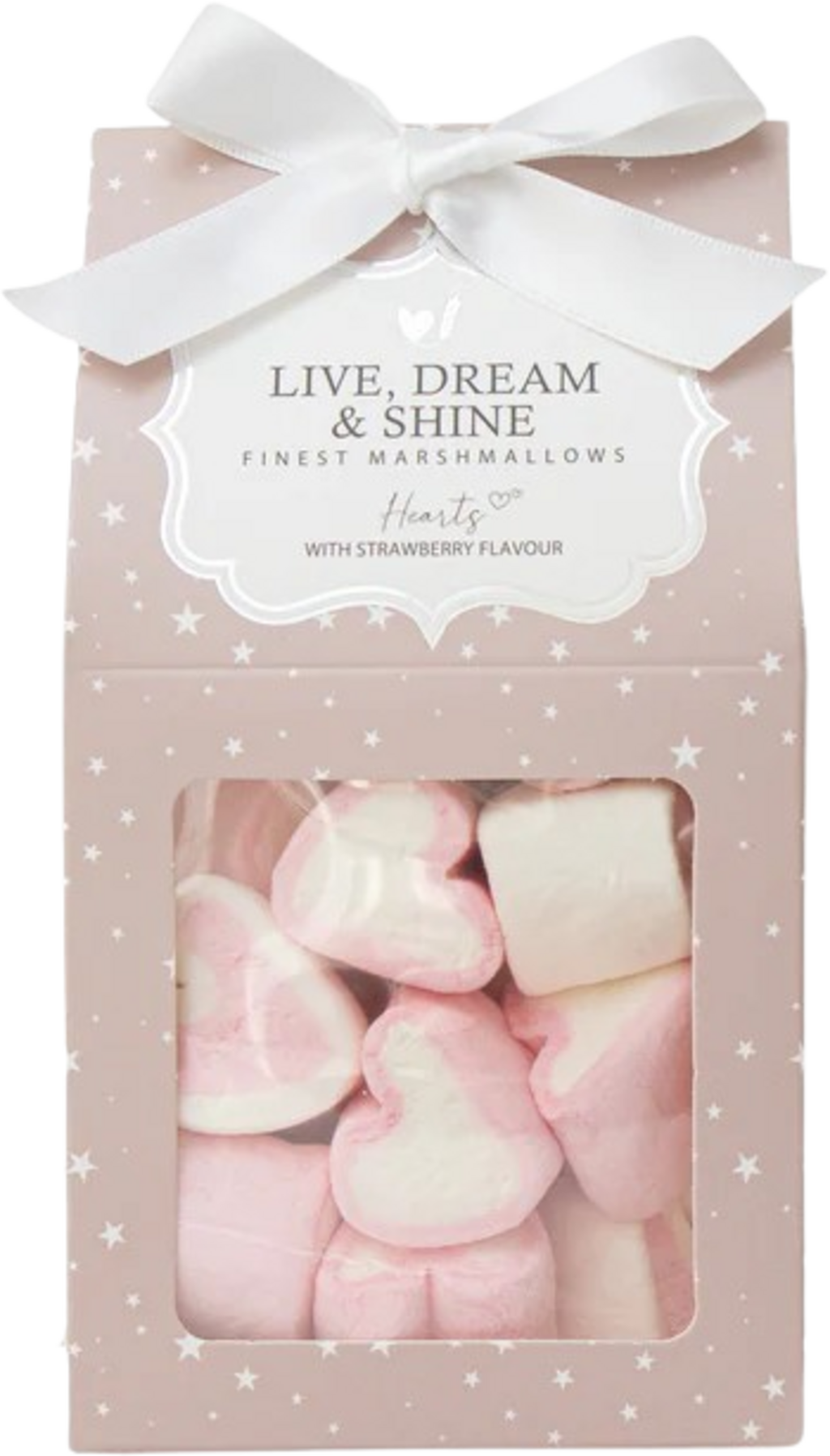 Luftig, süß und mit liebevoller Botschaft: Diese rosa und weißen Marshmallow-Herzen mit Erdbeergeschmack vereinen zarten Genuss mit einem inspirierenden Design. Ideal als kleines Mitbringsel, zum Naschen zwischendurch oder als Topping für Trinkschokoladen, Torten und mehr.