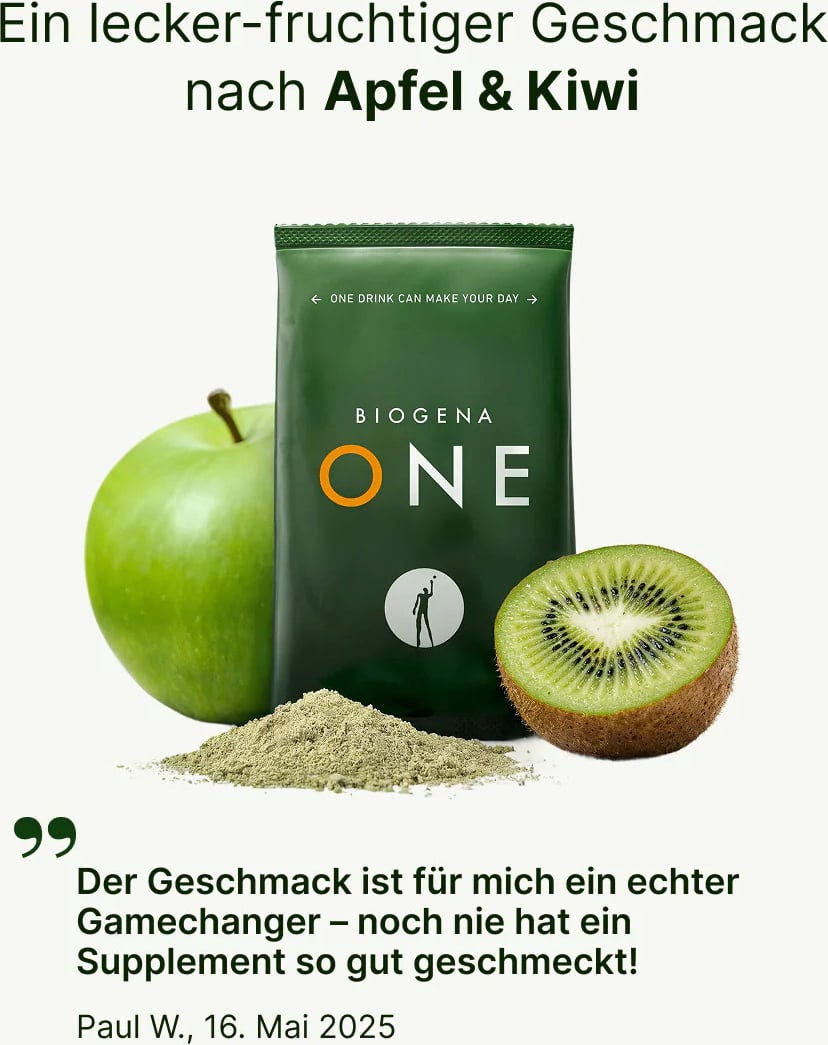 BIOGENA ONE ist der Green Drink der nächsten Generation und überzeugt mit einer Nährstoffformulierung aus 99 wertvollen Inhaltsstoffen. Die einzigartige Mischung enthält 13 Vitamine, 11 Mineralstoffe und Spurenelemente, 10 Lacto- und Bifidobakterienkulturen und 49 erlesene Pflanzenstoffe. Darunter Traube, Traubenkern, Granatapfel, Olivenblatt, Heidelbeere, Schwarzer Johannisbeere und Zitrusfrüchte, die die Quelle wertvoller Antioxidantien darstellen. Auch geschmacklich ist BIOGENA ONE eine wahre Sensation. Apfel, Kiwi, Gurke und einer Prise Wasabi-Blattpulver machen deine tägliche Nährstoffversorgung zu einem besonderen Genussmoment. Entwickelt zur täglichen Unterstützung deiner Ernährung.