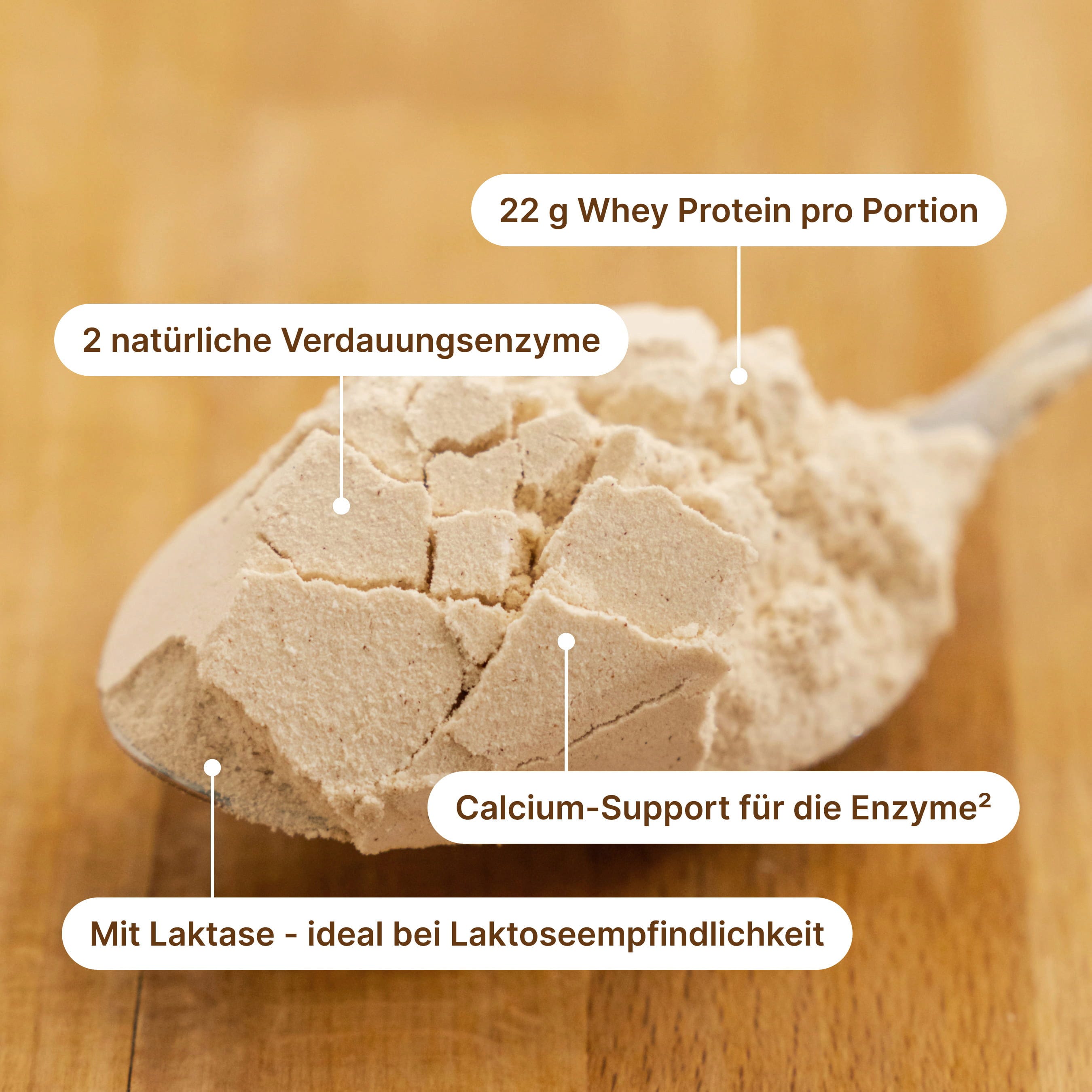 92 % Proteinmischung (Molkeproteinkonzentrat, Molkenproteinisolat, Emulgator (Sonnenblumenlecithine)), Resistentes Dextrin (Ballaststoff[1]), natürliches Aroma, Salz, Verdickungsmittel (Xanthan), 0,33 % Bromelain, Süßungsmittel (enzymatisch hergestellte Steviolglycoside), 0,17 % Papain, entaromatisiertes Vanillepulver, 0,1 % Laktase