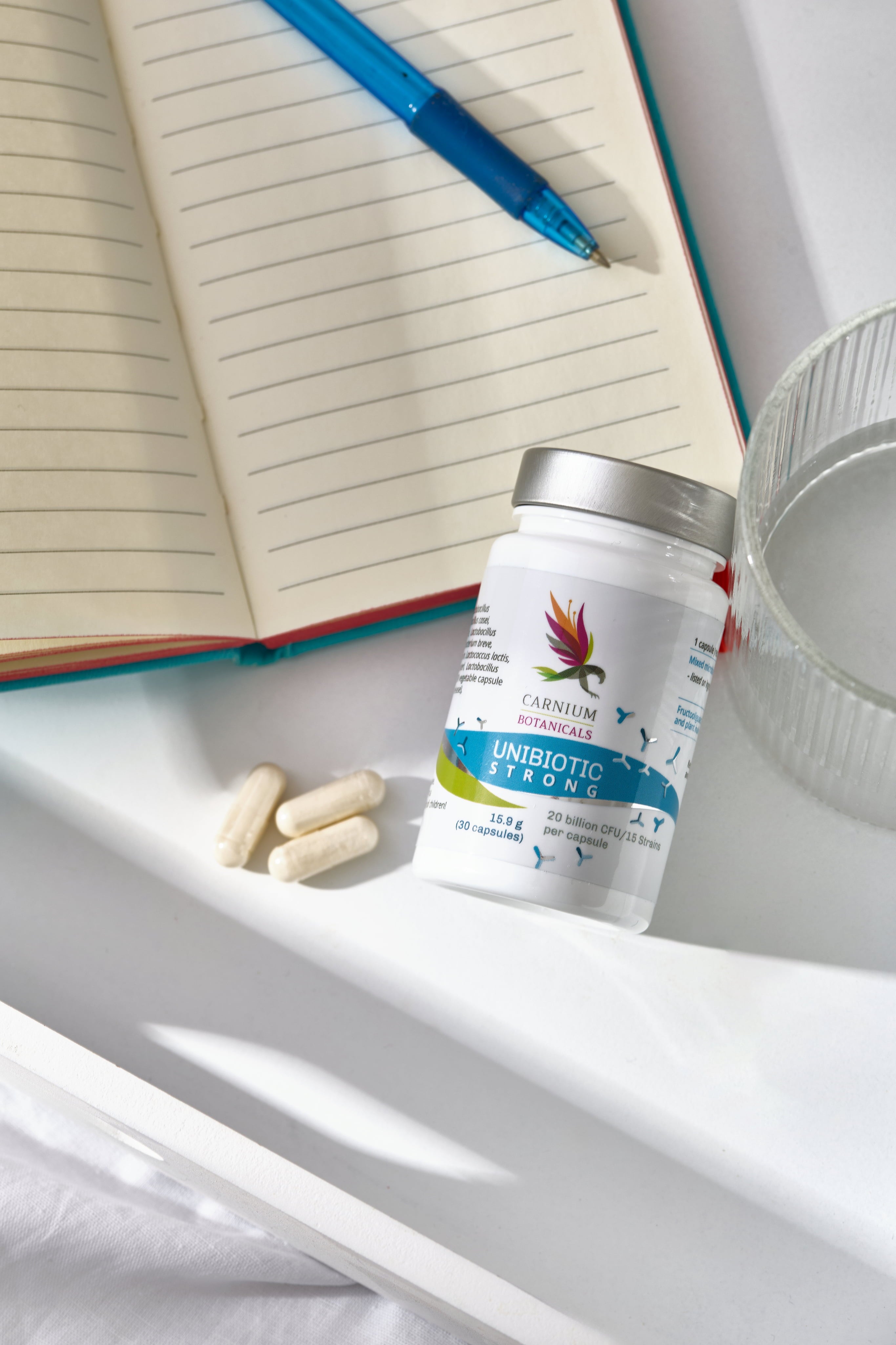 Unibiotic STRONG von Carnium Botanicals enthält eine Mischung aus 15 probiotischen Stämmen und Präbiotika. Darunter befinden sich beispielsweise Lactobacillus acidophilus, Lactobacillus rhamnosus, Bifidobacterium breve und Streptococcus thermophilus. Zustätzlich enthalten die Kapseln pflanzliches Inulin und Fructooligosaccharide. Die Kapseln sind zu 100 % vegan und glutenfrei.
