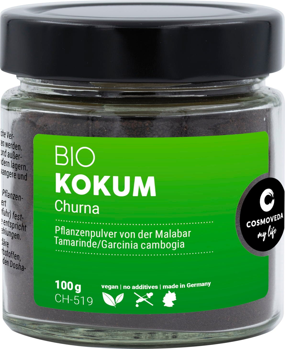 Kokum - Garcinia indica - ist ein mittelhoher Baum mit einem dichten Blätterdach aus elliptischen bis länglich-lanzettlichen, dunkelgrünen und glänzenden Blättern mit tomatengroßen, bräunlichfarbenen, gelb marmorierten Früchten mit sehr fetthaltigen Samen, die die Kokumbutter liefern. Verwendet werden in der ayurvedischen Ernährung Früchte und Samen. Das in eigener Produktion fein und schonend (unter 40°C) vermahlene Pulver der getrockneten Früchte stammt aus eigener Indischen und Srilankesischen Fair Trade und Bio Projekten von Cosmoveda.