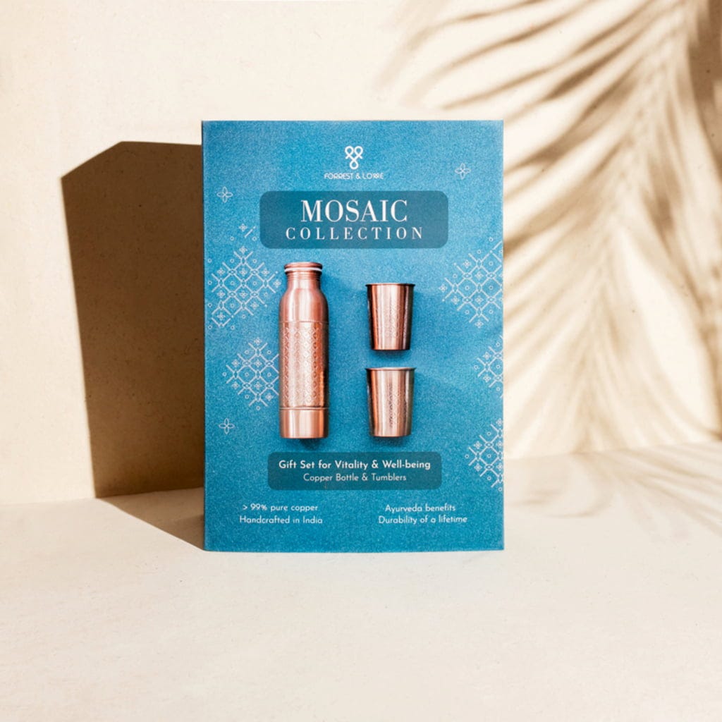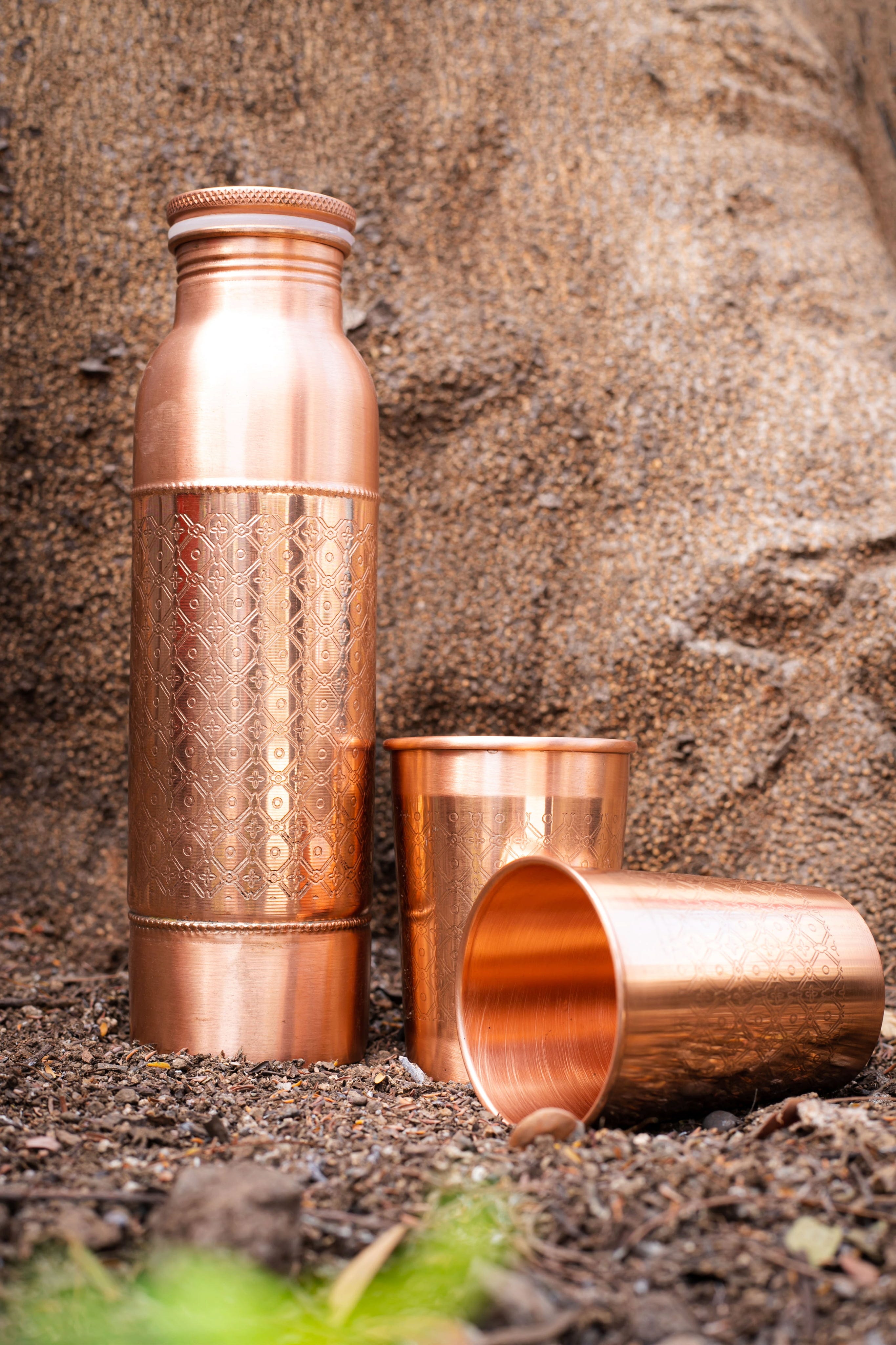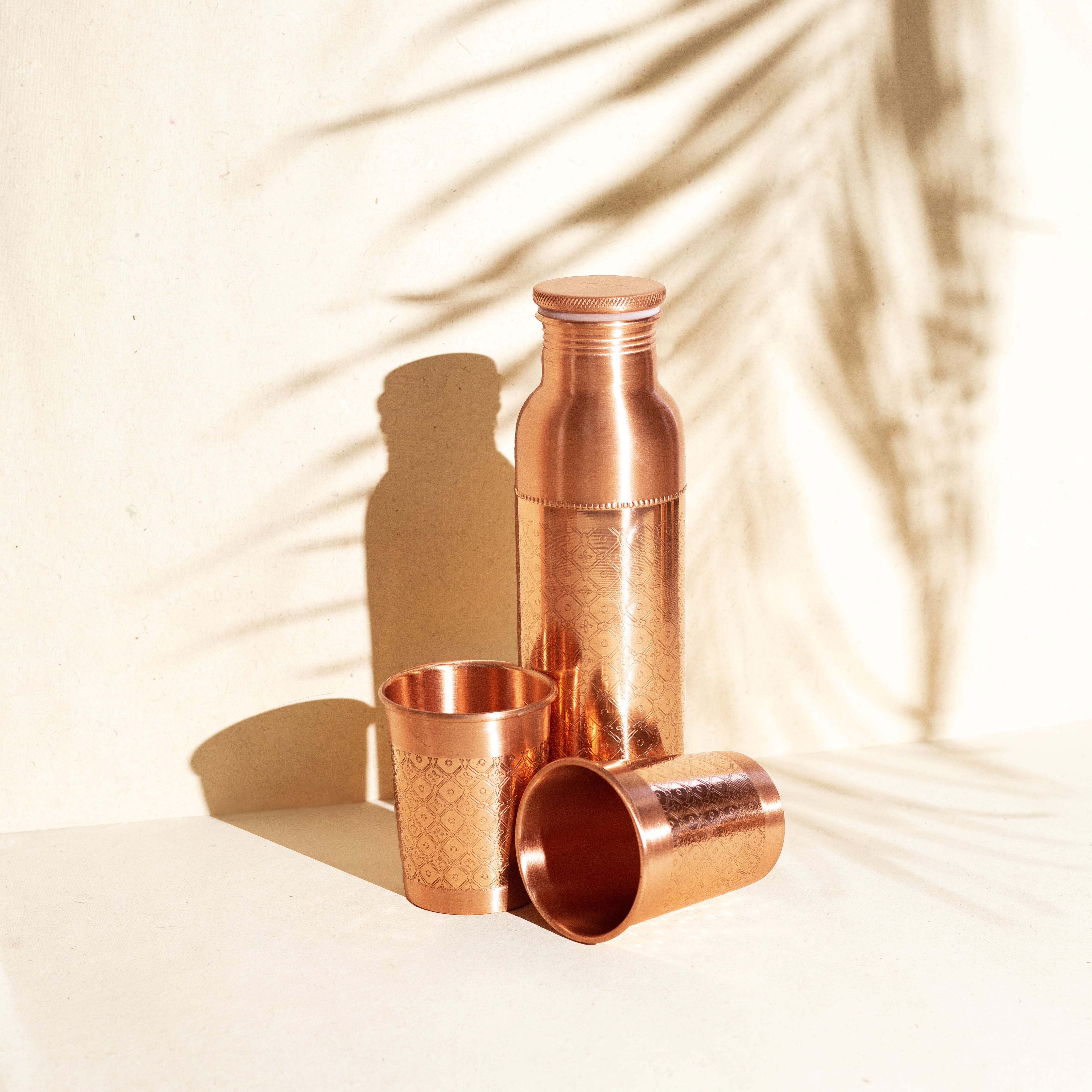 Inspiriert von palastartigen Holzarbeiten, besticht dieses bezaubernde Design durch seine Feinheit, die durch den Kupferglanz unterstrichen wird. Die Flasche und die beiden Becher sind handgefertigte Unikate und bezaubern mit ihrer geometrischen Schönheit. Die Kupferkollektion ist ein schönes, langlebiges Geschenk.