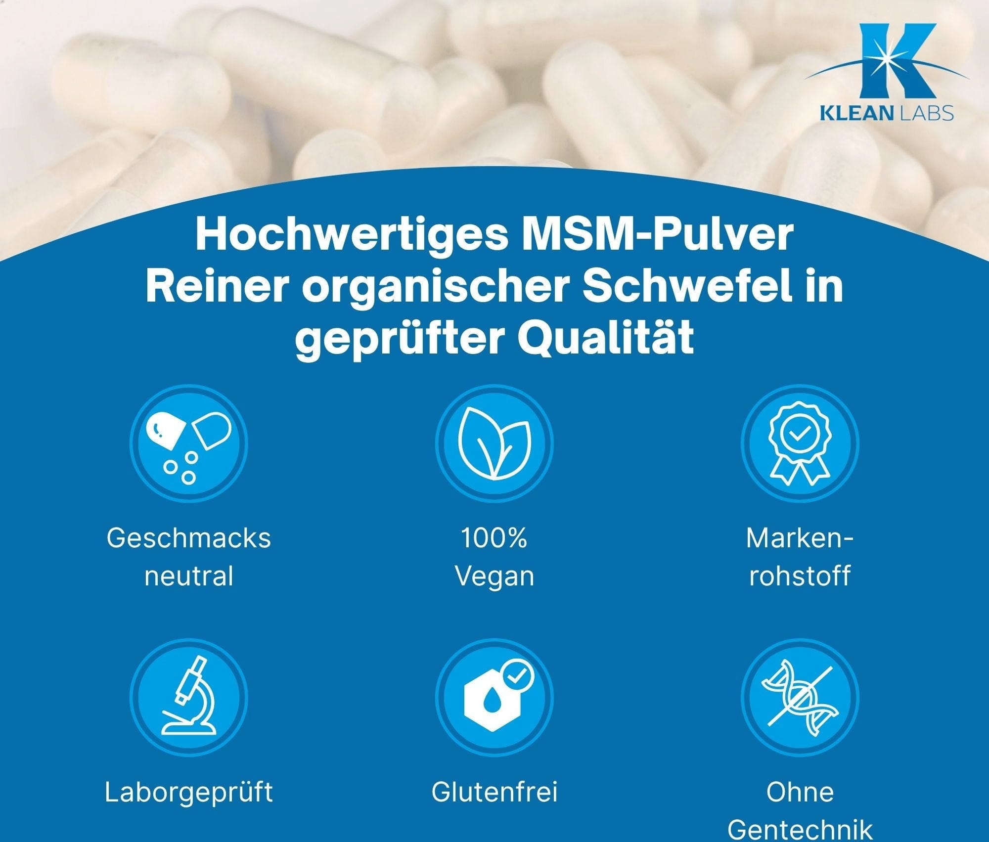 Das vegane und glutenfreie MSM Pulver von KLEAN LABS enthält 5 g reines MSM (Methylsulfonylmethan) pro Messlöffel. MSM ist ein organisch gebundener Schwefel, der im Körper ein Bestandteil von Aminosäuren und Enzymen ist.