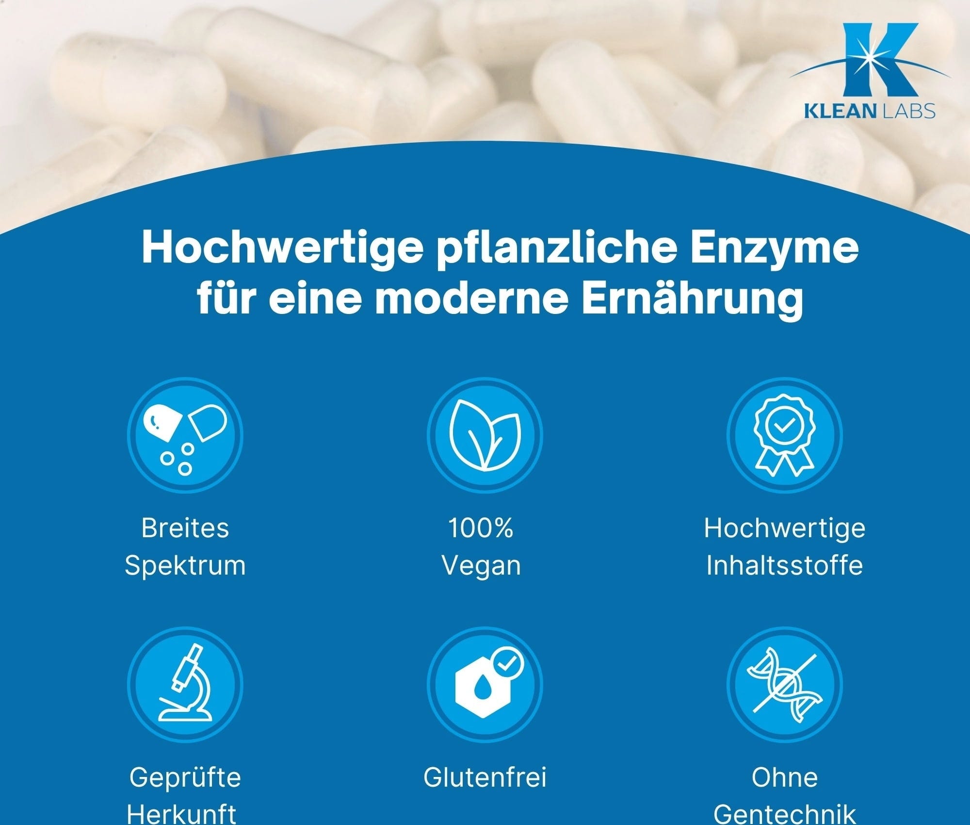 PlantZyme Extra KLEAN LABS enthält eine besonders hohe Dosierung pflanzlicher Enzyme sowie zusätzlich Cellulase. Diese spezielle Zusammensetzung deckt ein breites Spektrum an Nährstoffen ab und ist pH-stabil. Das Präparat eignet sich auch für eine ballaststoffreiche, pflanzenbetonte Ernährung.