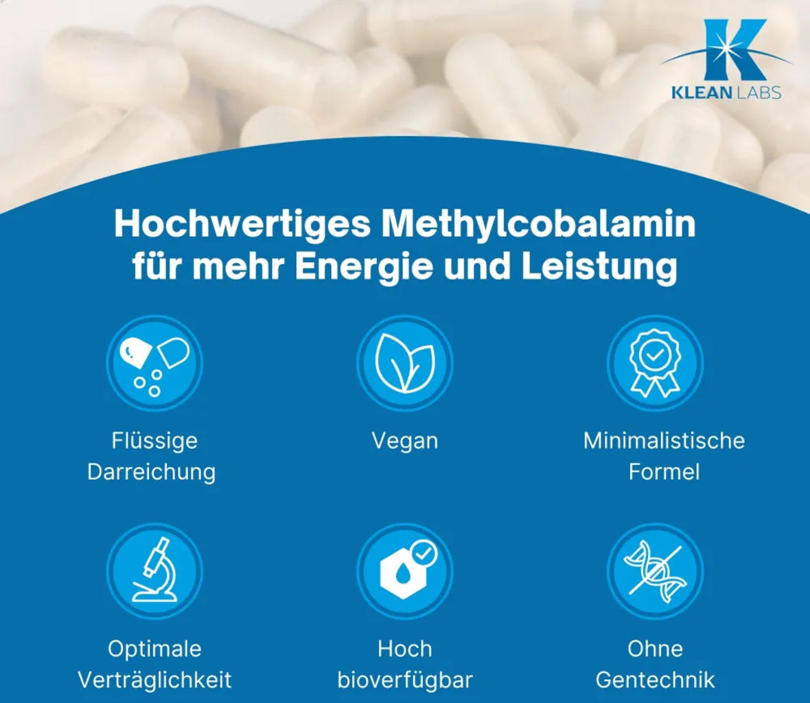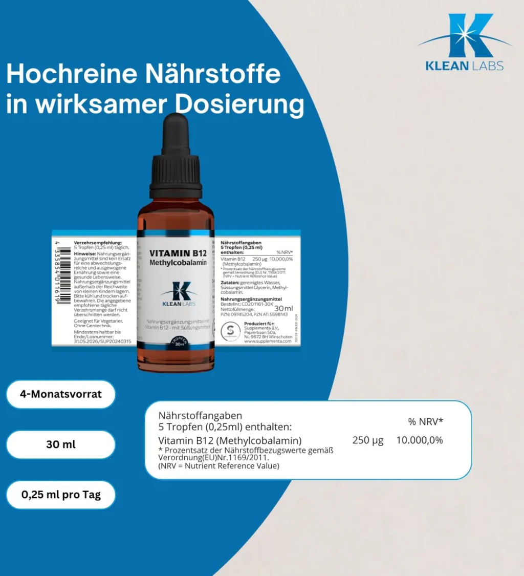 Diese Tropfen von Klean Labs bieten dir Vitamin B12 in der hochwertigen Form des Methylcobalamins. Durch die flüssige Darreichungsform auf Basis von Glycerin und gereinigtem Wasser ist eine präzise Dosierung sowie eine einfache Einnahme ohne das Schlucken von Kapseln möglich. Die Rezeptur ist bewusst puristisch gehalten und verzichtet vollständig auf Alkohol, künstliche Aromen oder Farbstoffe. Da das Produkt frei von tierischen Inhaltsstoffen sowie gluten- und laktosefrei ist, entspricht es höchsten Standards für eine bewusste Ernährung. Die Glasflasche ermöglicht eine hygienische Aufbewahrung und schützt die Qualität der Inhaltsstoffe über einen langen Zeitraum.