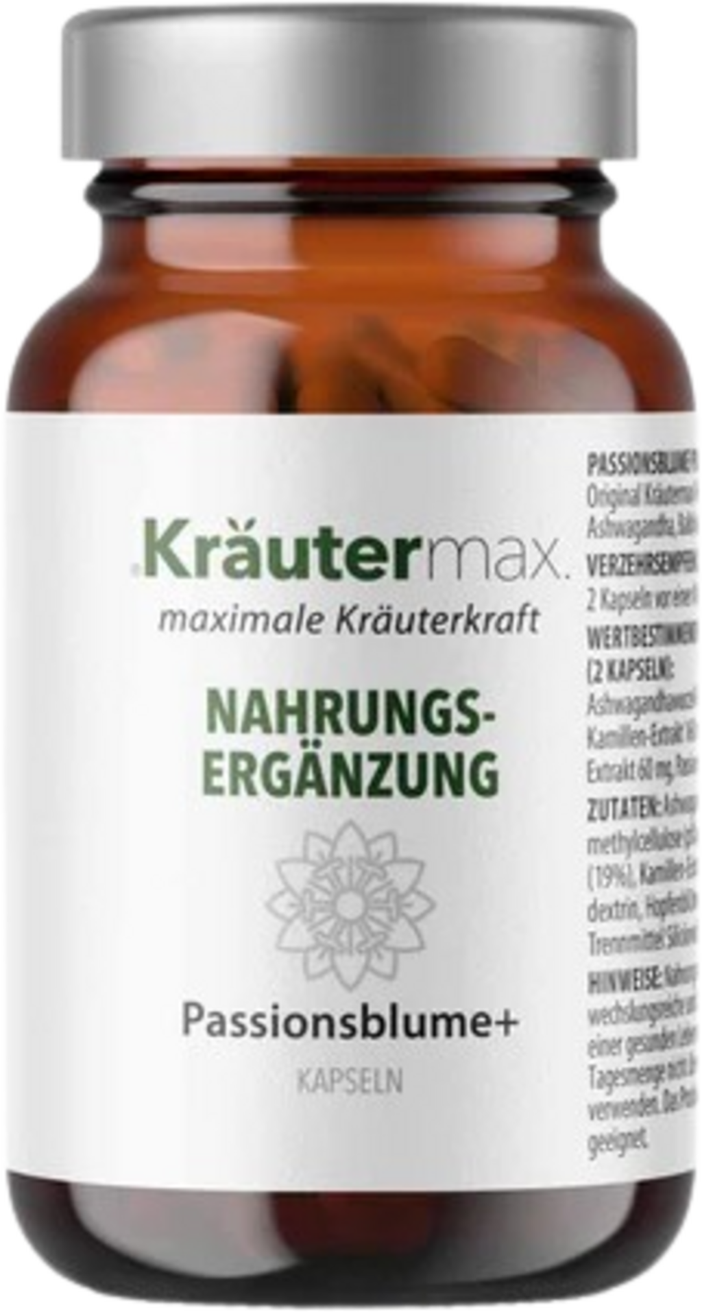 Mit den Kräutermax Passionsblume plus Kapseln erwirbst du ein sorgfältig abgestimmtes Nahrungsergänzungsmittel, hergestellt nach Original Kräutermax Rezeptur. Dieses rein pflanzliche Produkt kombiniert die Passionsblume (Passiflora incarnata) mit wertvollen Extrakten aus Zitronenmelisse, Baldrianwurzel und Hopfen.