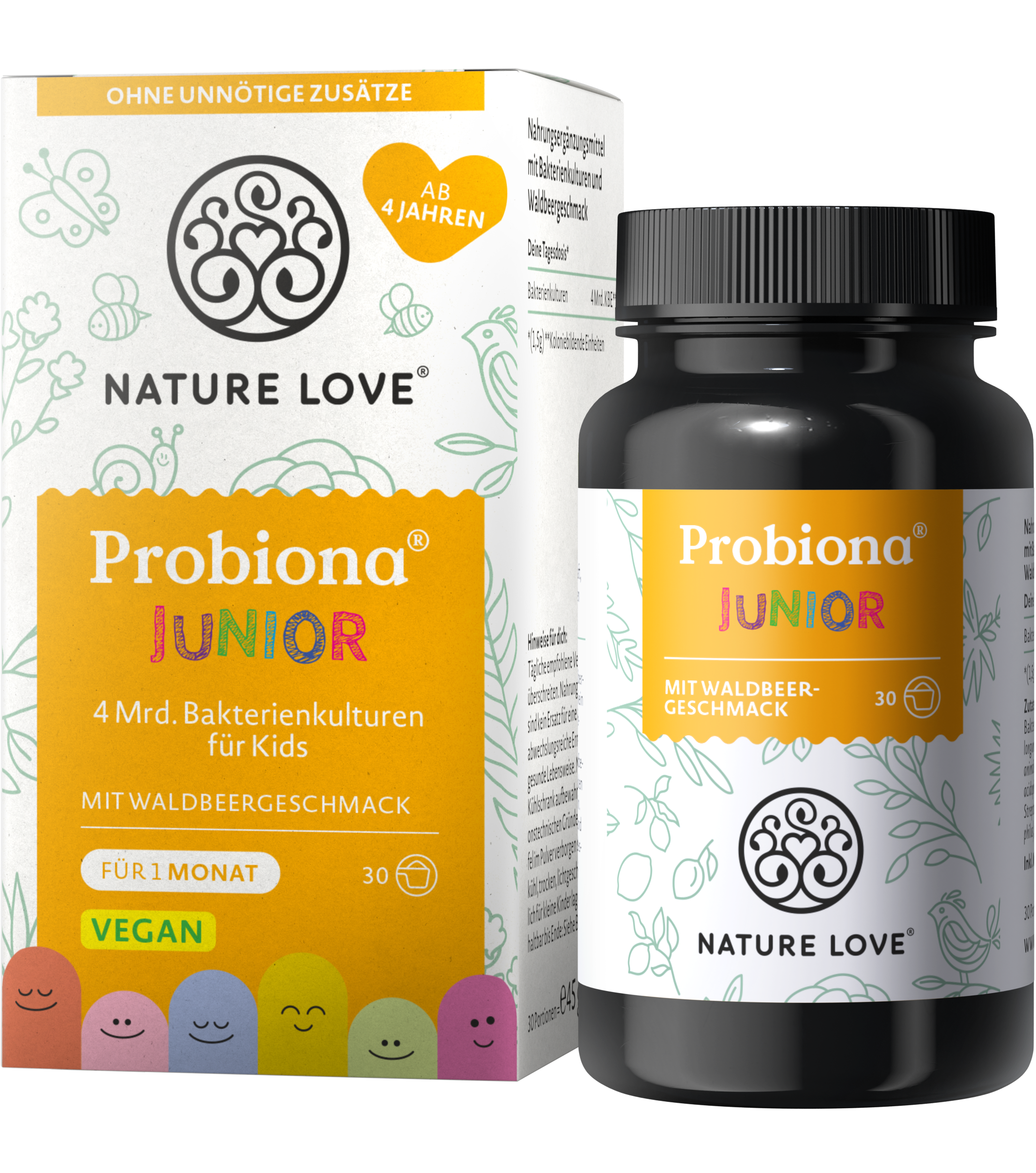 Probiona Junior® von Nature Love ist ein veganes Pulver, welches Kindern ab 4 Jahren eine tägliche Dosis von 4 Milliarden Bakterienkulturen aus 5 Bakterienstämmen liefert. Folgende Bakterienstämme sind in der Rezeptur enthalten: