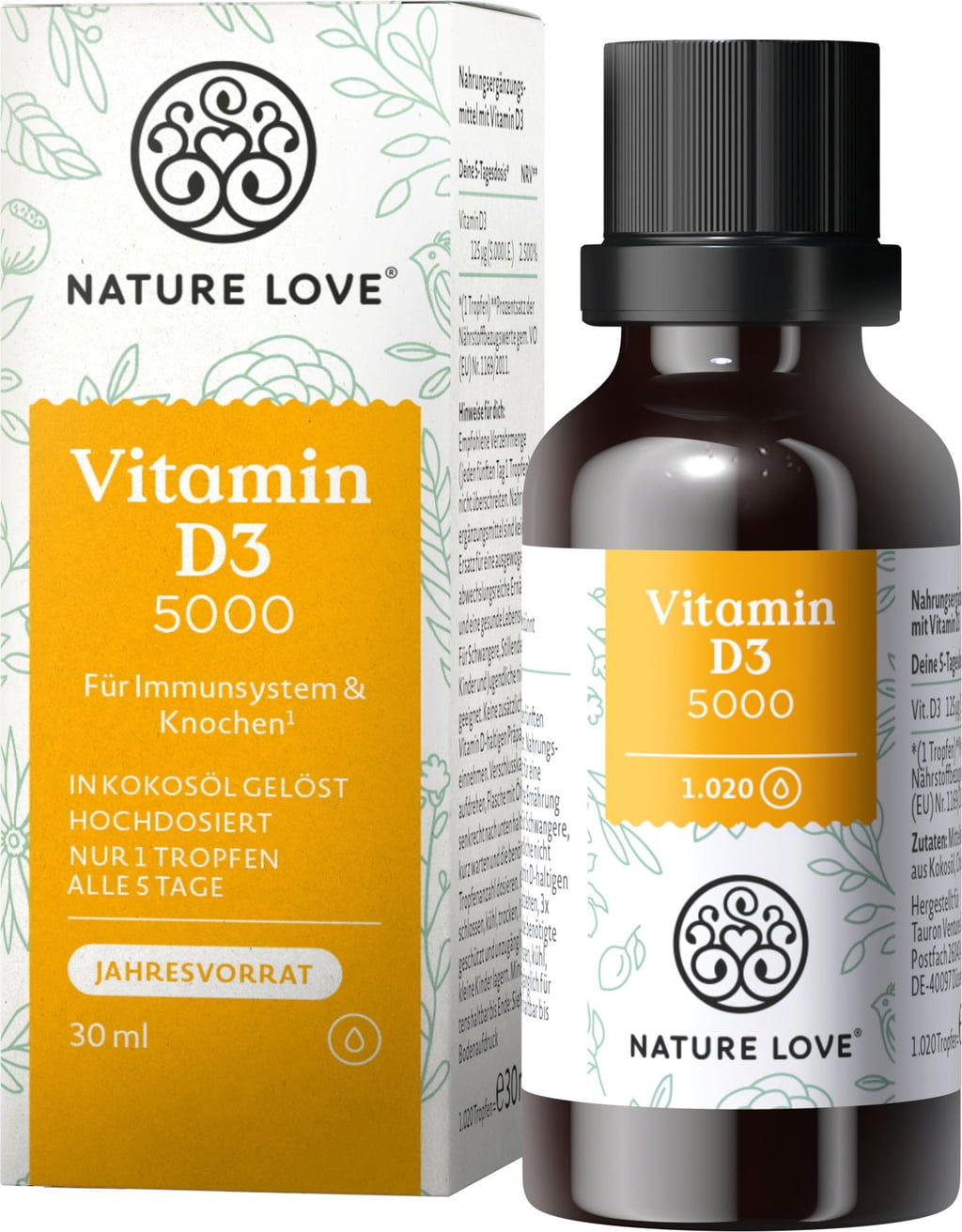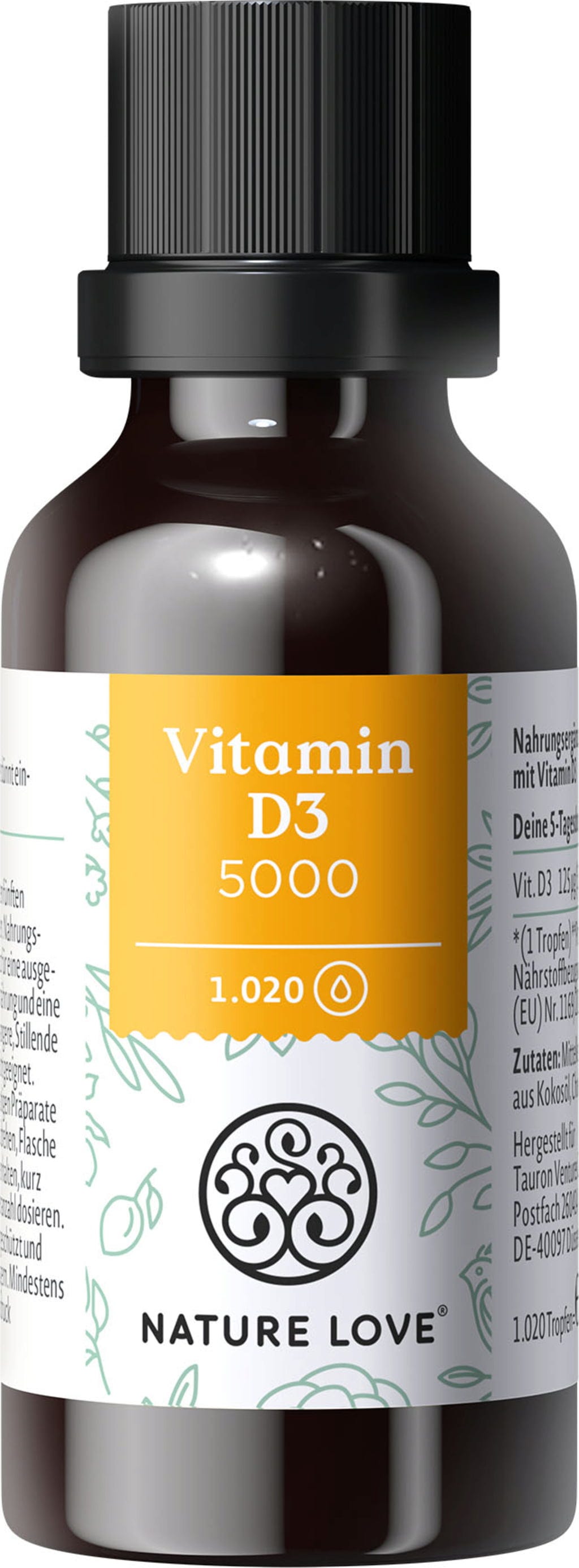 Mit den Vitamin D3 Tropfen von Nature Love hält man ein bisschen Sonne in den Händen. Ein Tropfen des Öls enthält 5000 internationale Einheiten Vitamin D3 (Cholecalciferol) - das entspricht 125 µg.