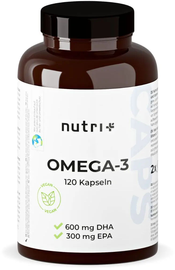 Die nutri+ Omega-3-Kapseln liefern hochwertiges, veganes Algenöl mit 600 mg DHA und 300 mg EPA pro Tagesdosis. Ergänzt mit natürlichem Vitamin E, sind die Kapseln eine nachhaltige, pflanzliche Alternative zu Fischöl.