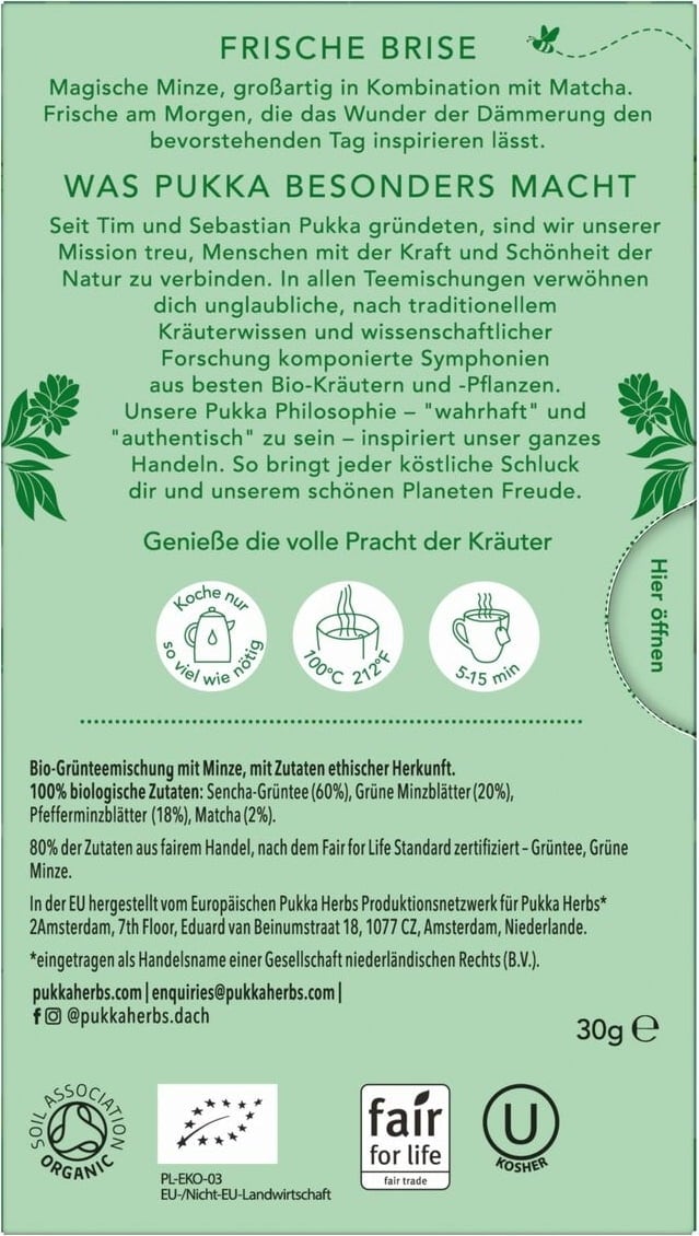 Dieser einzigartige Grüntee wurde von PUKKAs Kräuterexperten sowie Ernährungswissenschaftlern zusammengestellt und kombiniert die neuesten wissenschaftlichen Erkenntnisse mit traditionellem Kräuterwissen. Daraus resultiert eine synergetische Kombination aus Bio-Minze, Pfefferminze, grünem Sencha-Tee und Matcha, die eine ausgewogene Tasse mit kühlenden Aromen und subtilen, reichhaltigen Noten ergibt. Für eine herrliche Tasse voll vitalisierendem Geschmackserlebnis.
