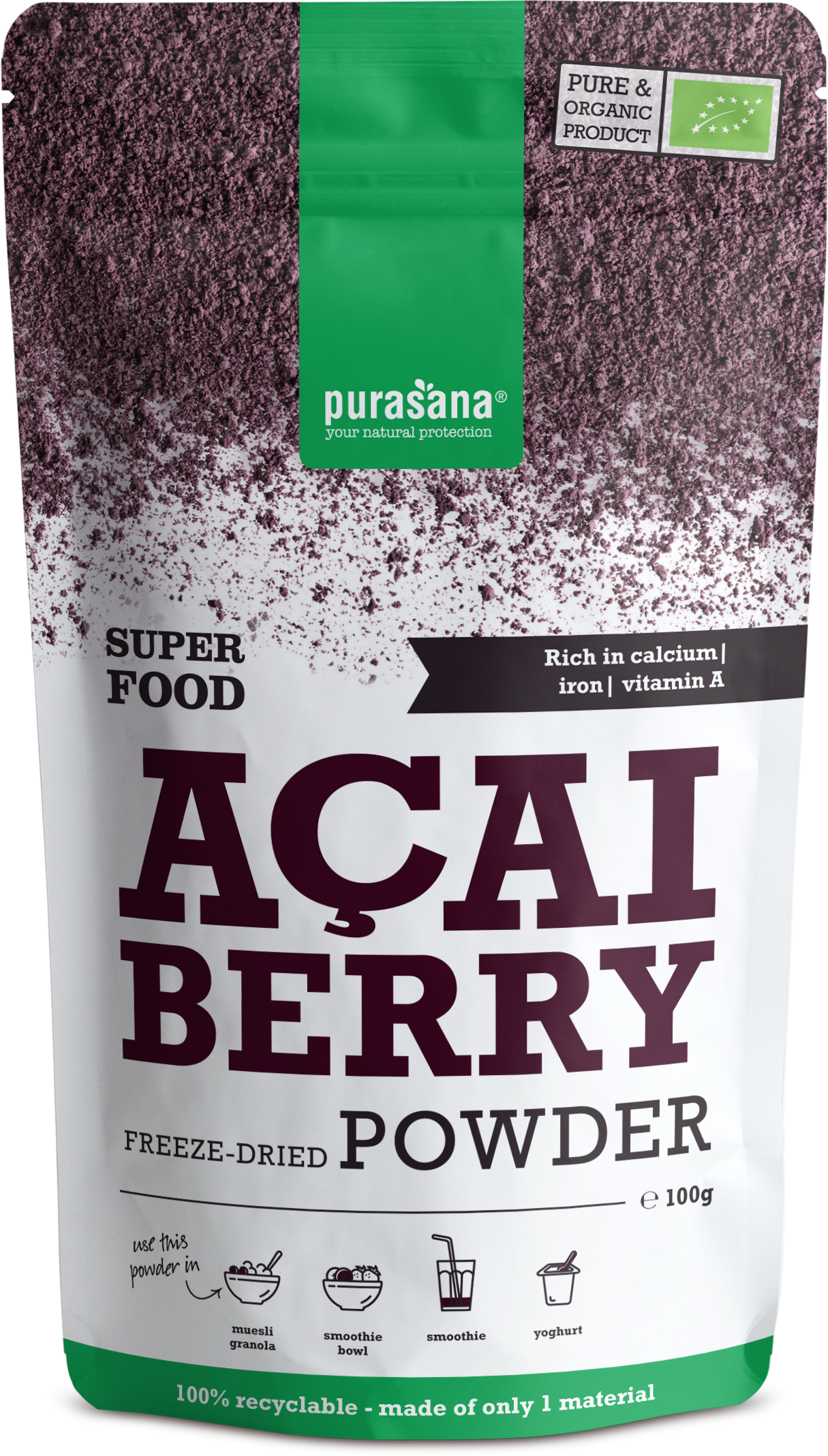 Acai Beeren sind traubenartige Beeren welche an Palmen an den Ufern des Amazonas gedeihen. Wenn die Beeren reif sind, sind diese reich an Nährstoffen und wird zu leuchtend violetten Pulver verarbeitet und gefriergetrocknet. Acai Beeren enthalten von Natur aus viele Nährstoffe und sekundäre Pflanzenstoffe. Durch die Gefriertrocknung werden diese Nährstoffe optimal erhalten.