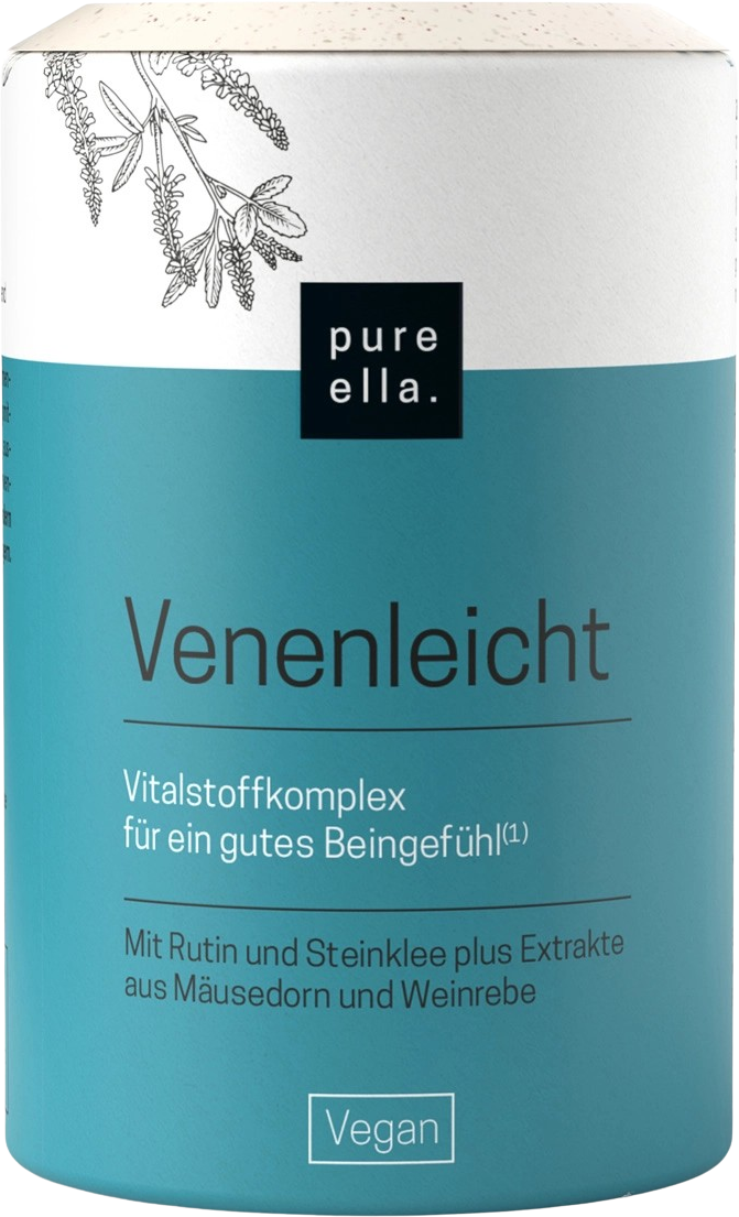Venenleicht von Pure Ella kombiniert hochwertiges Rutin aus japanischem Schnurbaumblüten-Extrakt mit ausgewählten Pflanzenextrakten aus Steinklee, Weinrebe und Mäusedorn. Ergänzt wird die Rezeptur durch die Mineralstoffe Mangan und Kupfer.