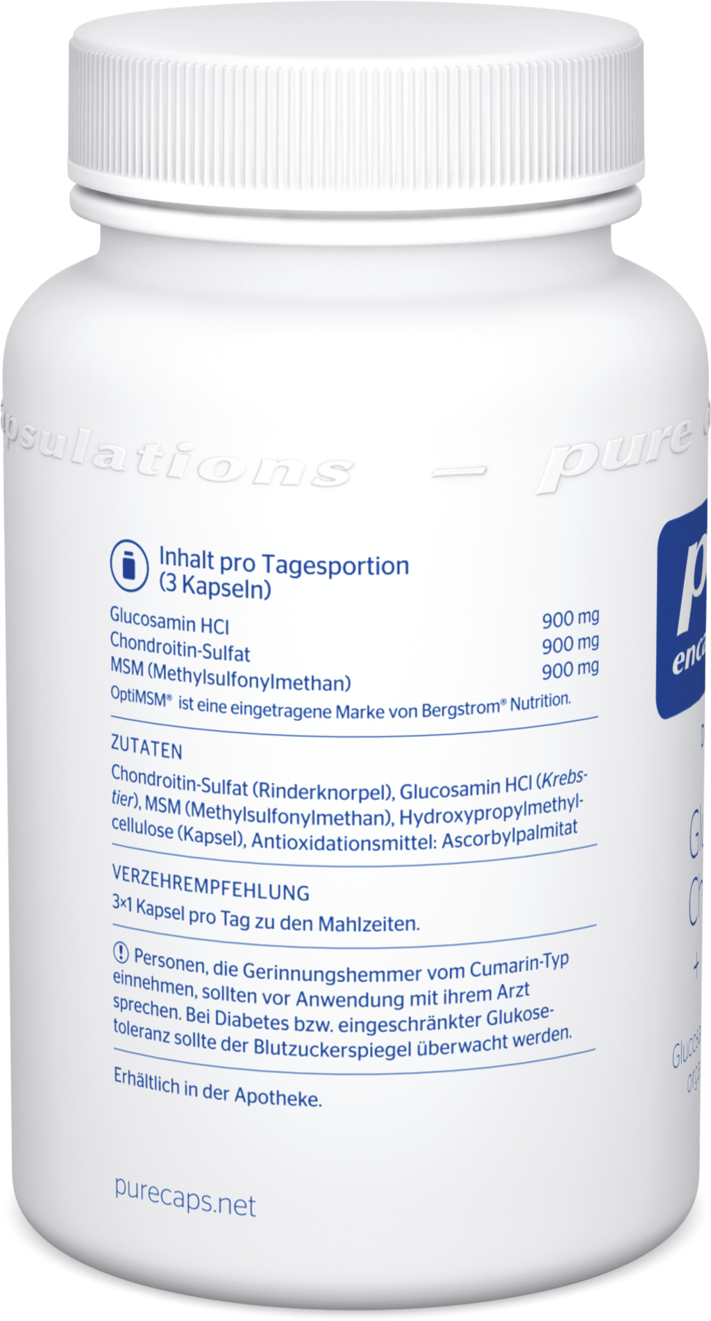 Das Nahrungsergänzungsmittel in Kapsel-Form beinhaltet Chondroitin Sulfat, Glucosamin HCl und Methylsulfonylmethan (MSM).
