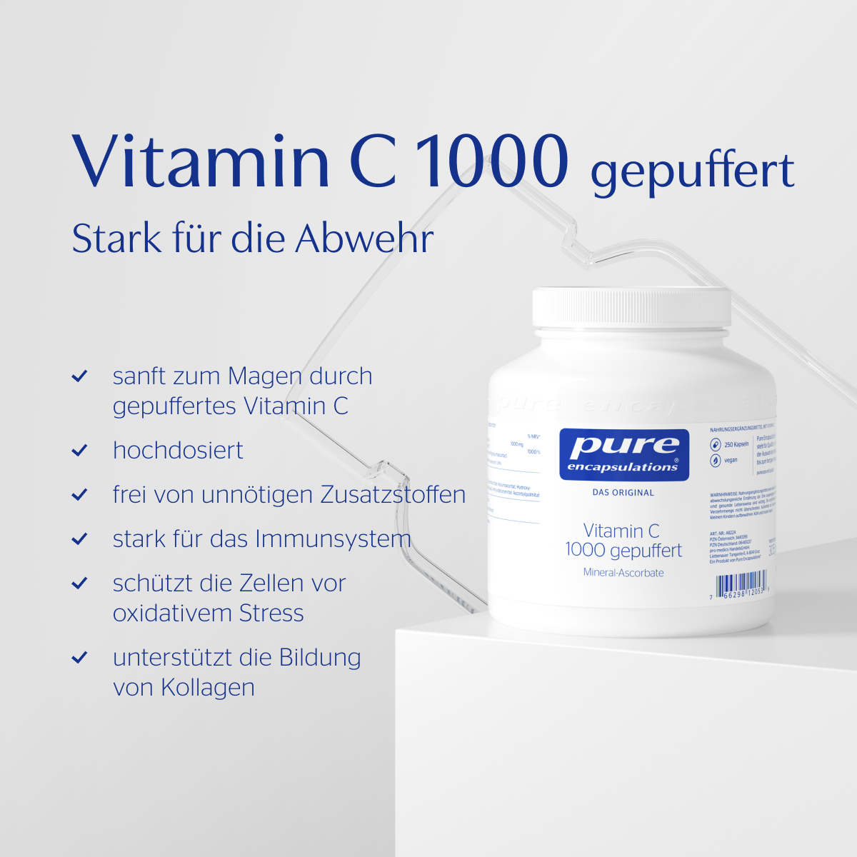 Vitamin C als Ascorbinsäure kann in manchen Fällen schlecht vertragen werden. Das gepufferte Vitamin C von Pure Encapsulations® weist beinahe einen neutralen pH-Wert auf und stellt somit keine Säurebelastung dar. Das Produkt liefert zusätzlich den Mineralstoff Calcium sowie das Spurenelement Kalium.