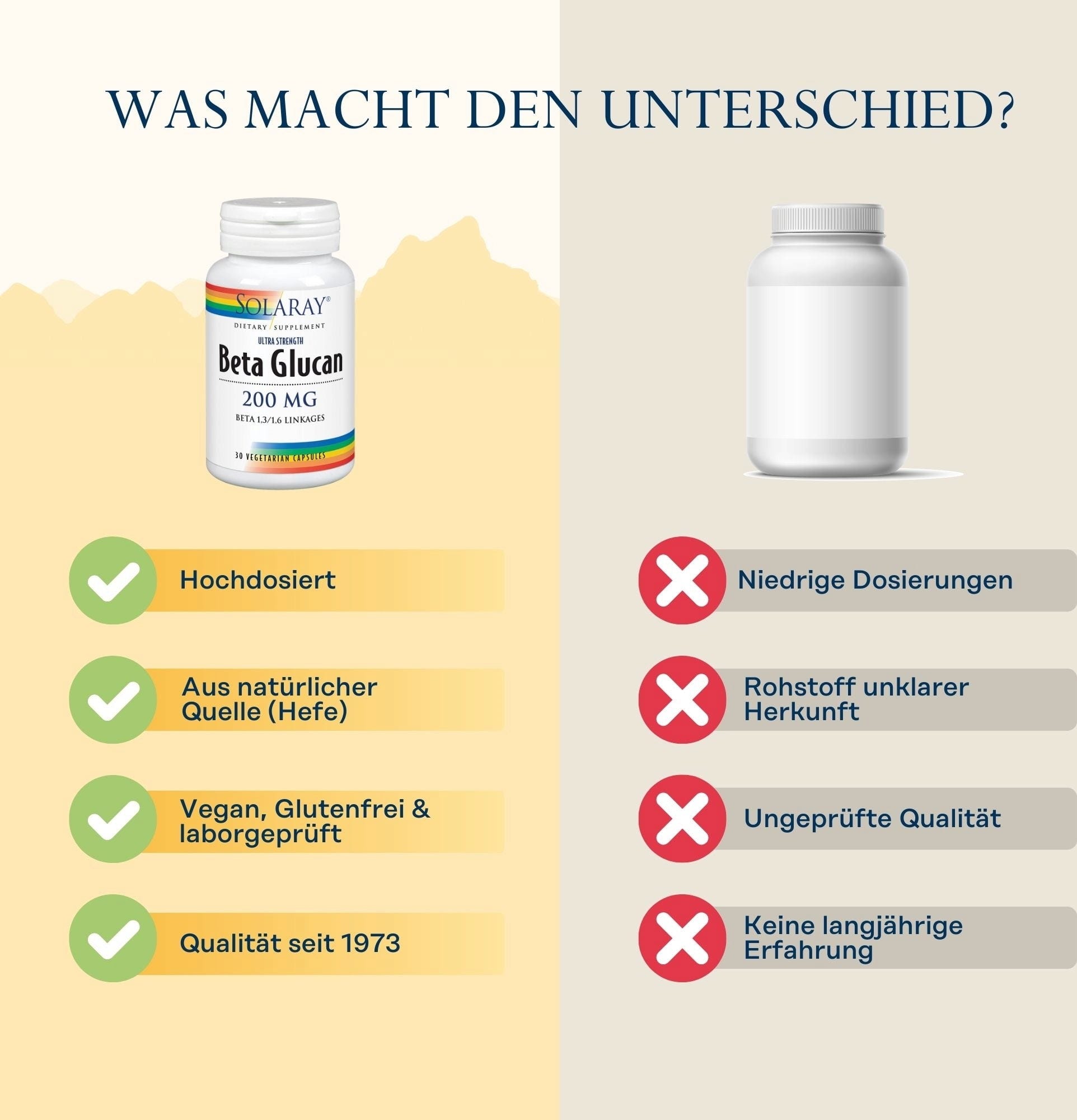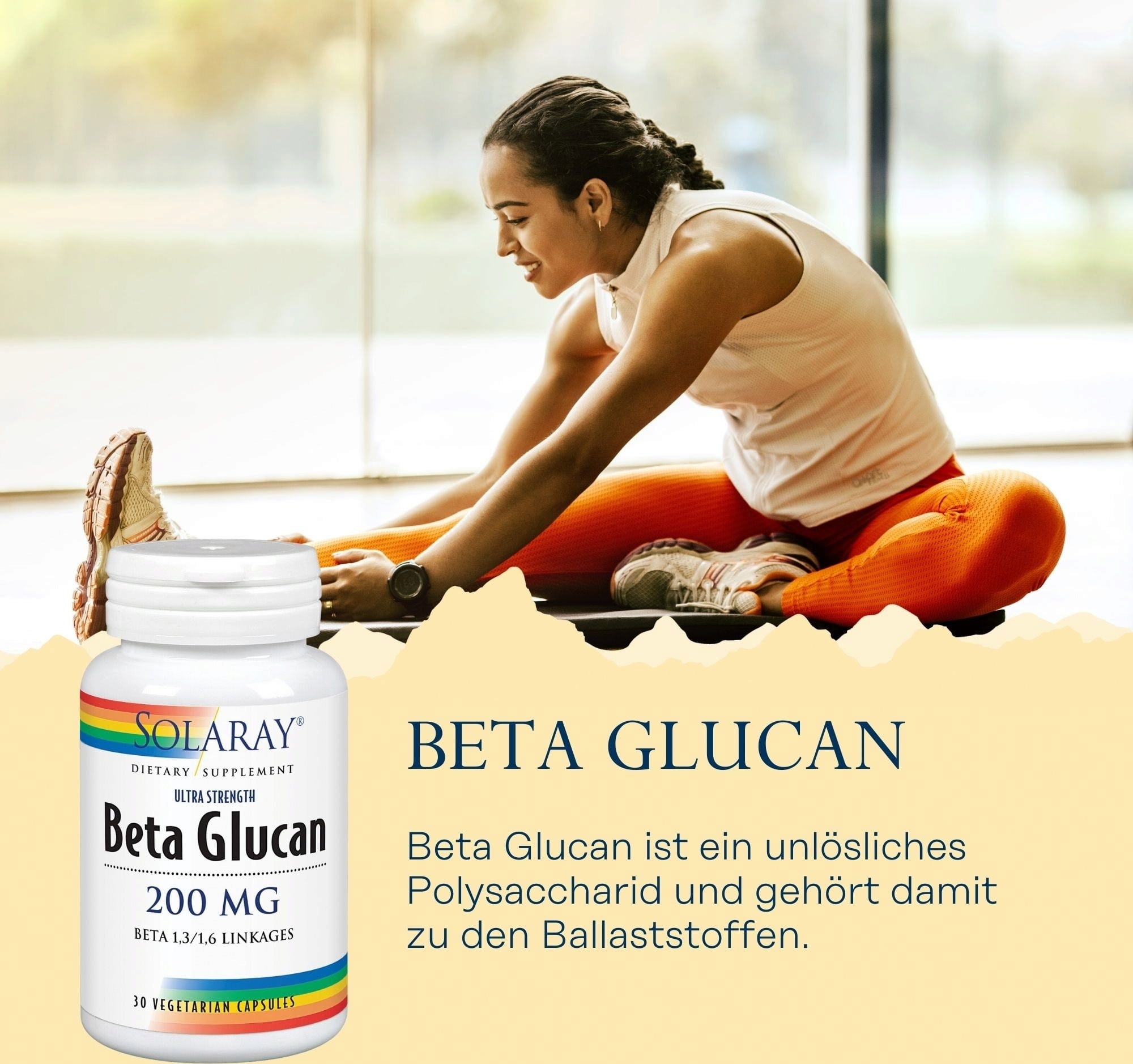 Beta Glucan ist ein unlösliches Polysaccharid und zählt zu den Ballaststoffen. Die veganen Beta Glucan Kapseln von Solaray enthalten 200 mg 1,3/1,6 Beta Glucan aus den Zellwänden der Bäckerhefe. Die Kapseln sind außerdem frei von Gluten und Gentechnik.
