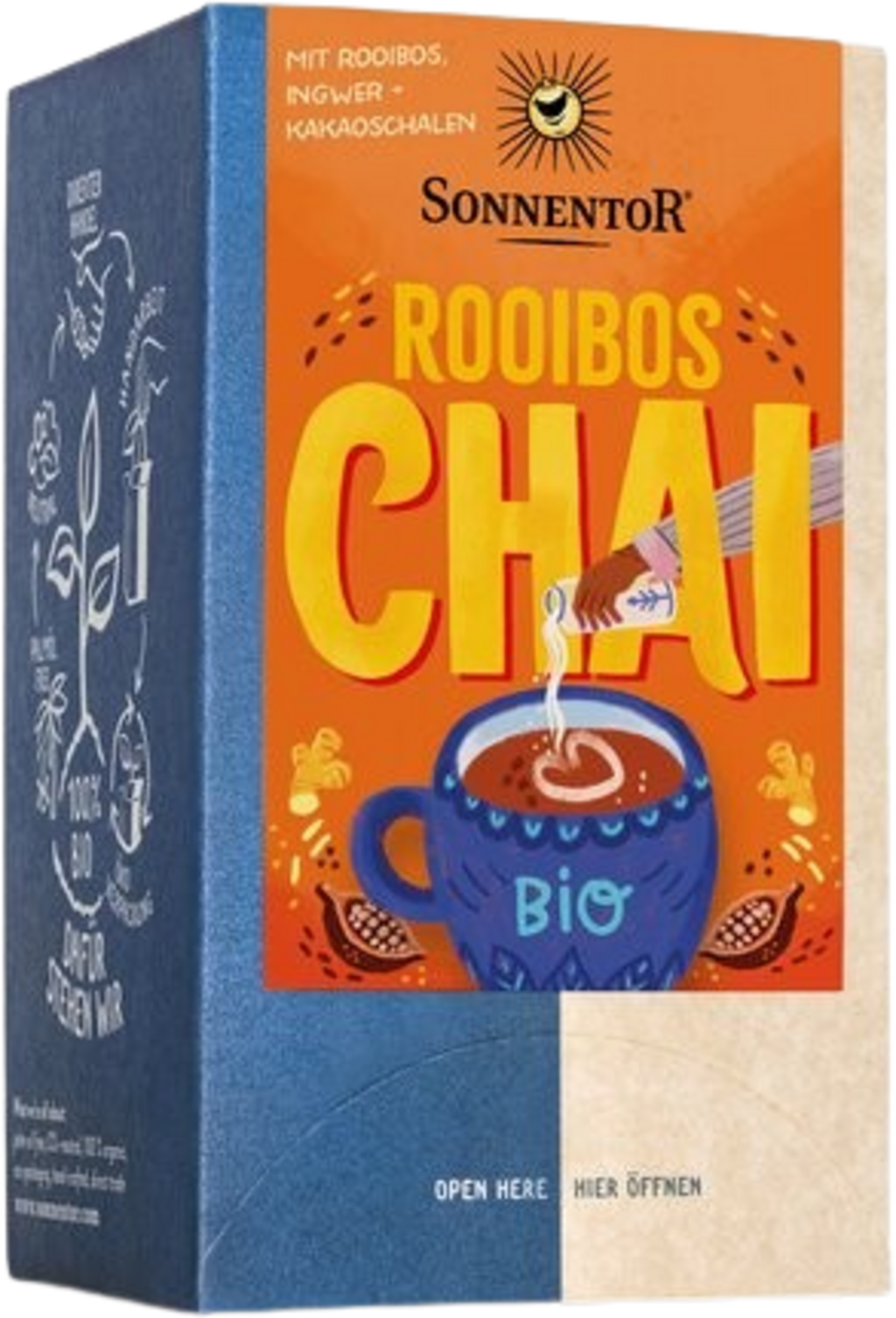 Schmecke die intensiven Chai-Gewürze in Kombination mit Rooibos. Diese einzigartige Teemischung von Sonnentor verführt dich geschmacklich in die Welt der orientalischen Gewürze. Freue dich auf die Geschmacksvielfalt aus malzigen, schokoladigen, würzigen und scharfen Aromen.
