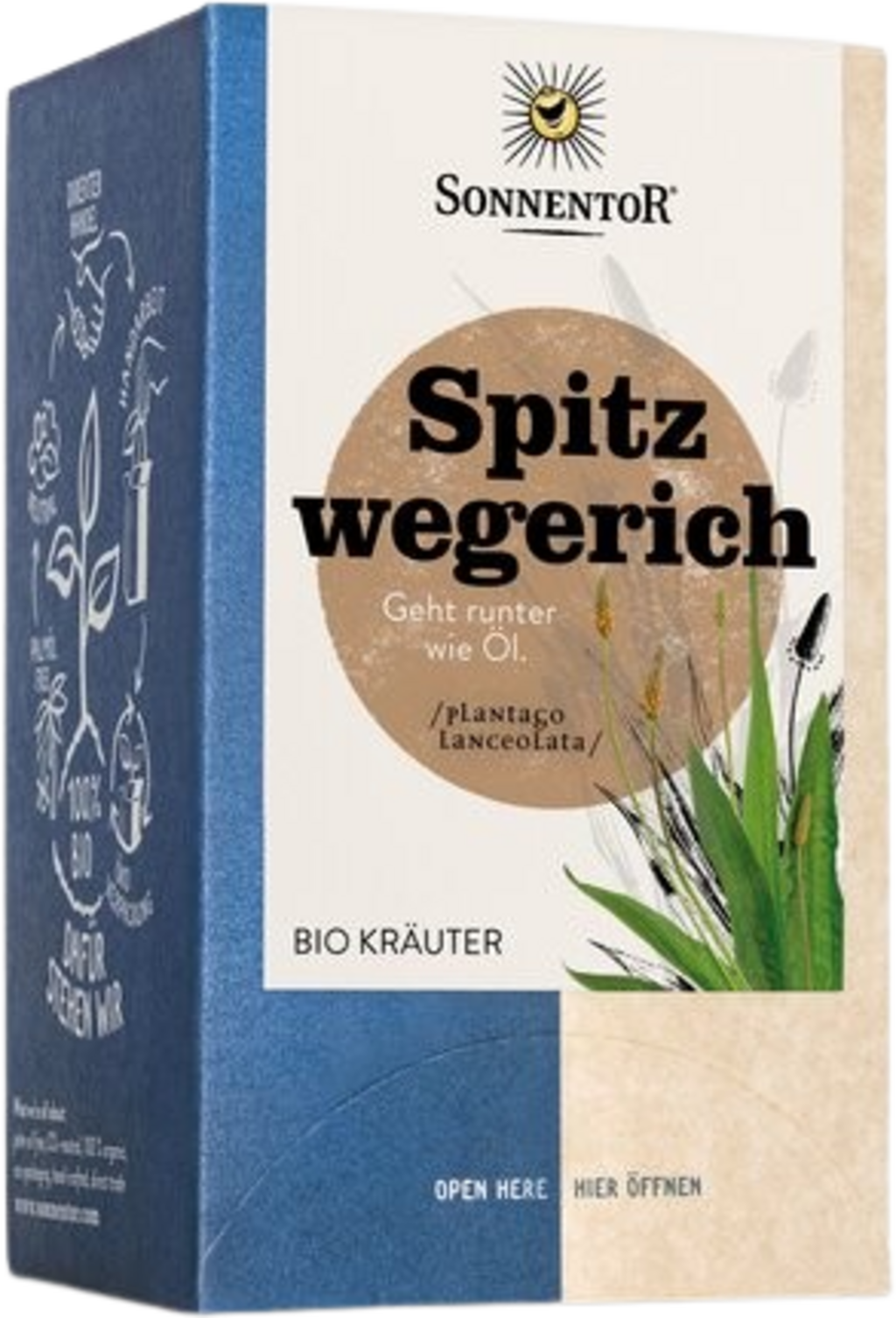 Sein charakteristisches Aussehen ist unverkennbar und so ist der Spitzwegerich im Sommer überall auf Wiesen- und Ackerrändern zu entdecken. In praktischen Doppelkammerbeuteln abgefüllt, bietet sich der Spitzwegerich von Sonnentor bestens für Heißgetränke an. Im Geschmack entfaltet er pilzige, grasige und süßliche Aromen.
