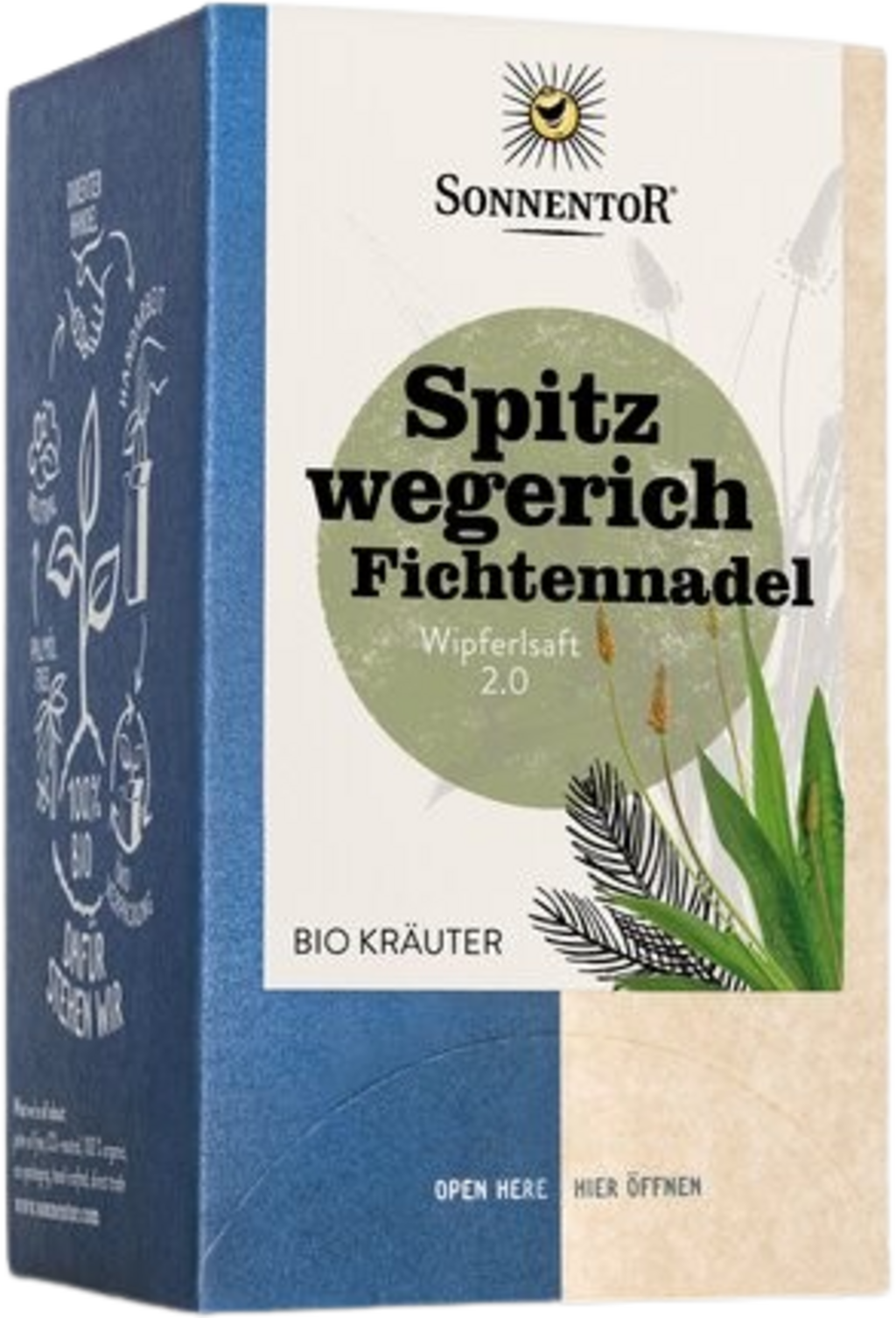 Sein charakteristisches Aussehen ist unverkennbar und so ist der Spitzwegerich im Sommer überall auf Wiesen- und Ackerrändern zu entdecken. In Kombination mit Fichtennadeln dient er als Wipfelsaft und überzeugt im Duo durch einen einzigartigen Geruch und Geschmack. Freue dich auf die süßlich harzigen und waldigen Aromen, die in die Nase aufsteigen und intensiv zu schmecken sind. Sonnentor kombiniert die beiden Kräuter in praktischen Teebeuteln, für einen schnellen Aufguss und Genuss, wann immer Zeit dafür ist.
