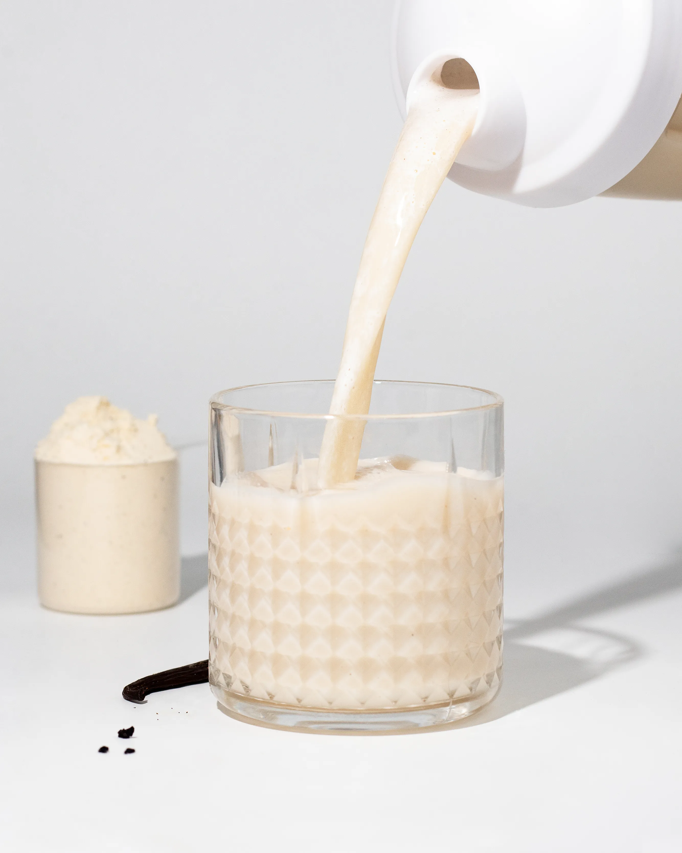 98 % ultrafiltriertes Molkenproteinkonzentrat (Milch, Emulgator (Sonnenblumenlecithin)), natürliches Aroma, 0,2 % gemahlene Vanilleschoten, Süßungsmittel (Steviolglykoside)