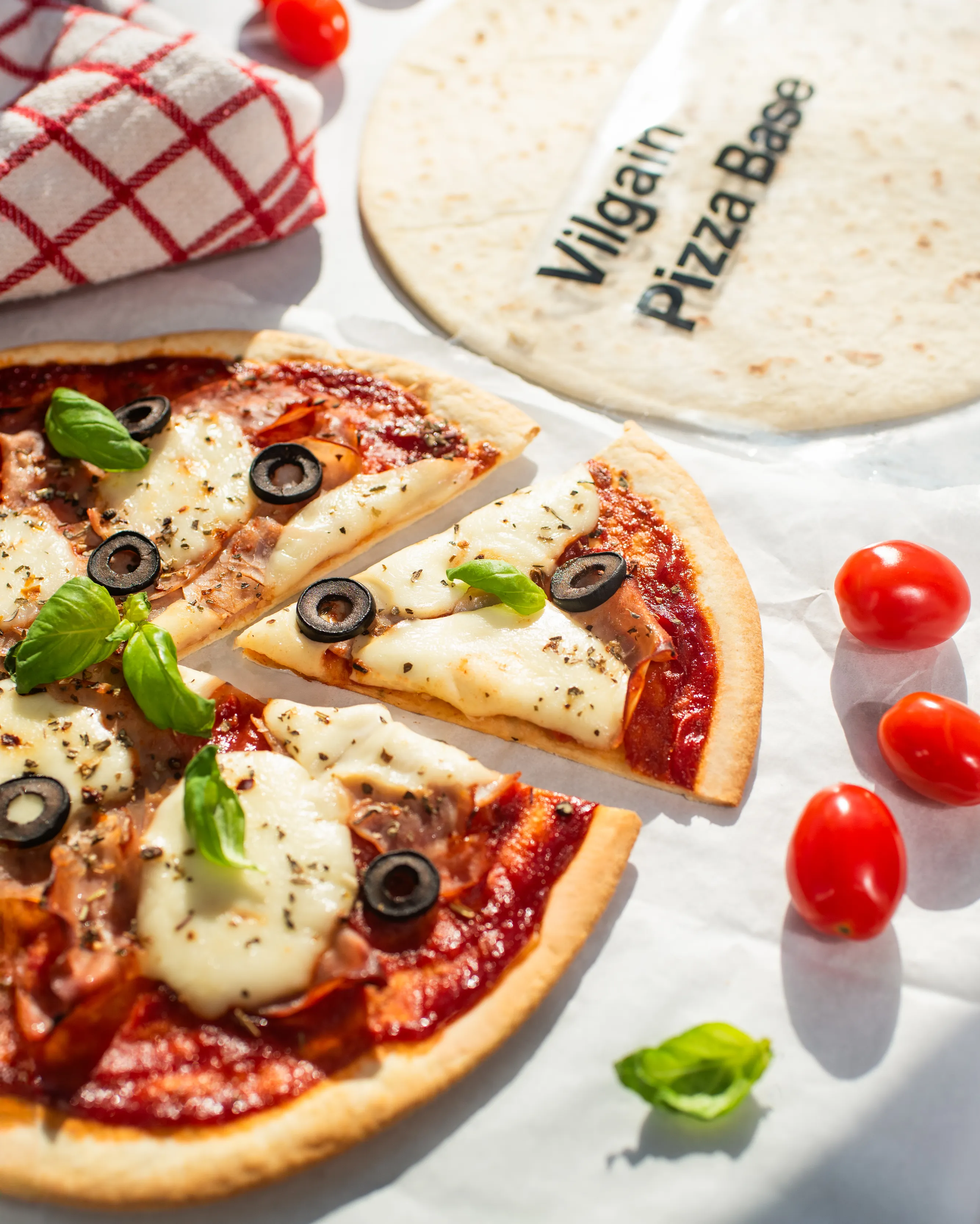 Den Backofen auf 220 °C vorheizen. Den Teig belegen und auf Backpapier für 7–8 Minuten backen (die Zeit kann je nach Ofen und Belag variieren). Alternativ kannst du die Pizza abgedeckt in einer Bratpfanne zubereiten oder den Teig direkt roh als Beilage zu Suppen oder Dips genießen.